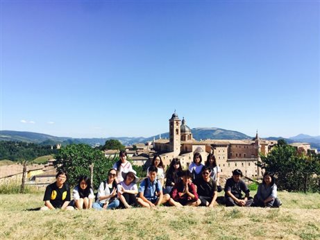 8月23日,一个美丽的晴天,写生实习小组离开了科尔托纳镇来到了山城乌尔比诺,它是文艺复兴三杰之一拉斐尔的家乡。这座城市坐落在一处大斜坡上,仍保留着古老的中世纪风情。临近目的地,大家还未见到那座古镇,只听见马老师激昂的大喊到:“同学们快看!”,忽然间,在骄阳下矗立着的金黄色城池跃入眼帘。乌尔比诺公爵费达蒙特费尔特罗热爱艺术,在文艺复兴早期,他慷慨无偿的资助吸引了大批的艺术家和学者来到此处,创作了丰富多彩高水准的作品,极大地推动了文艺复兴思潮的迅猛发展,与佛罗伦萨的美第奇家族异曲同工。小镇以其独特性和艺术性,为人文主义的深入埋下了火种。
