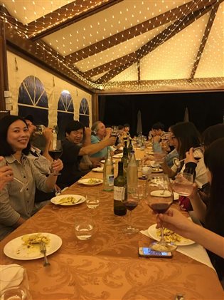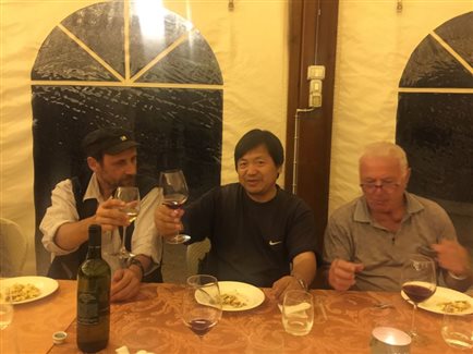 亚历山大•特劳迪教授、山德罗•巴齐教授及其家属们,在马切拉达会和。特劳迪教授请大家品尝了一次正宗的意大利晚餐,给不曾体验过的同学们一个惊喜。席间,觥筹交错,马老师将两位教授的画册带给大家传阅,使大家更进一步了解当代艺术的种种表现方式。两位教授也亲切的用不太熟练的中文和大家说笑着,特劳迪教授更是表示下一次到武汉,将来地大与大家交流有关当代艺术的看法,并做一次写生示范,写生实习小组成员纷纷表示热烈的欢迎。这个夜晚在愉悦欢畅的氛围中落幕,带给大家一个好梦。