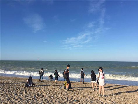 随后小组沿着东部海岸线向马切拉塔前行。途中老师给了同学们半个小时的时间来欣赏亚德里亚海的壮阔,用照片记录这这段难忘的旅程。海边的天是黛蓝的,越往下与海面相连处越浅,海天之间只有一线天光将两者区分。海浪轻轻翻涌着,水卷云舒,平静的水面下蕴含着一股力量。大家都兴奋地脱了鞋袜与海浪亲密接触,在这样令人目眩神迷的蓝天下感受着大自然充满生命力的美。