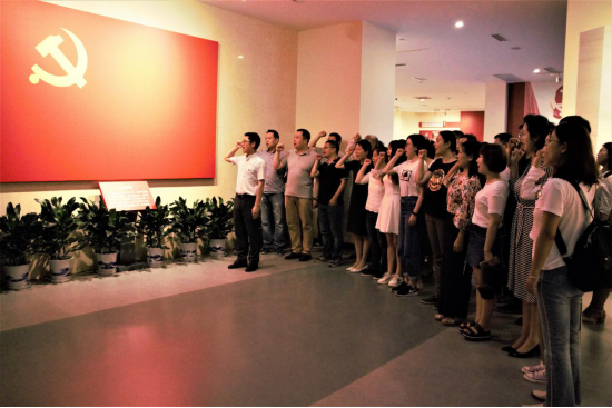 党委组织全体党员在《高举伟大旗帜重整行装再出发》展厅的党旗前重温入党誓词。各三级单位支部书记和草榴