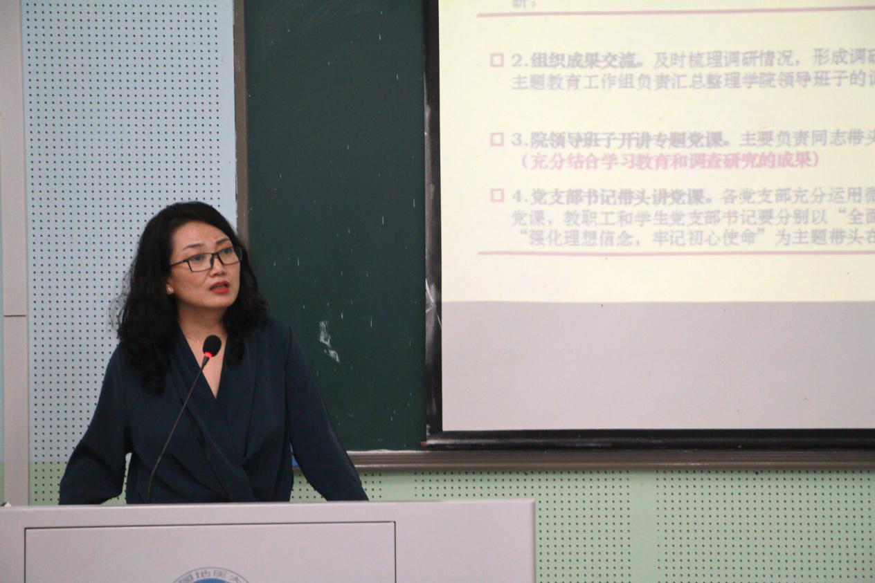 “不忘初心、牢记使命”主题教育的工作计划。郭秀蓉强调本次主题教育活动要聚焦主题,深入学习贯彻习近平新时代中国特色主义思想,加深对习总书记关于主题教育以及高等教育的重要论述的理解,同时在整个教育过程中突出问题导向,要求党员同志结合“自己找、群众提、集体议、上级点”深入查找问题,领导干部要树立一线规则,深入教学科研一线发现问题。此外,主题教育要做到贯穿结合。此次的主题教育活动由四项重要措施组成,这四项措施必须贯穿始终,广大党员既要注意将学习教育活动与庆祝新中国成立70周年结合起来,更要与草榴