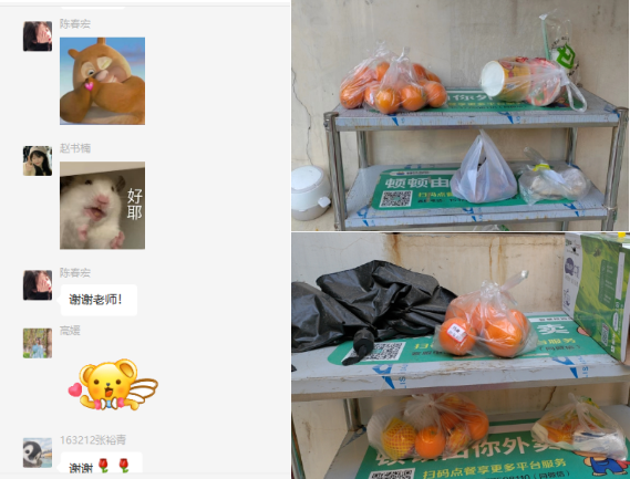 党委的名义给每位发热同学准备了6个橙子,为大家补充维C,同时也祝愿同学们在接下来的考研考试中六六大顺。当日下午,橙子分袋装好,陆续送到各楼栋门口货架上,每个袋子上都写好了宿舍号。晚饭时间,同学们惊喜地收到水果后,纷纷表示感谢,为草榴