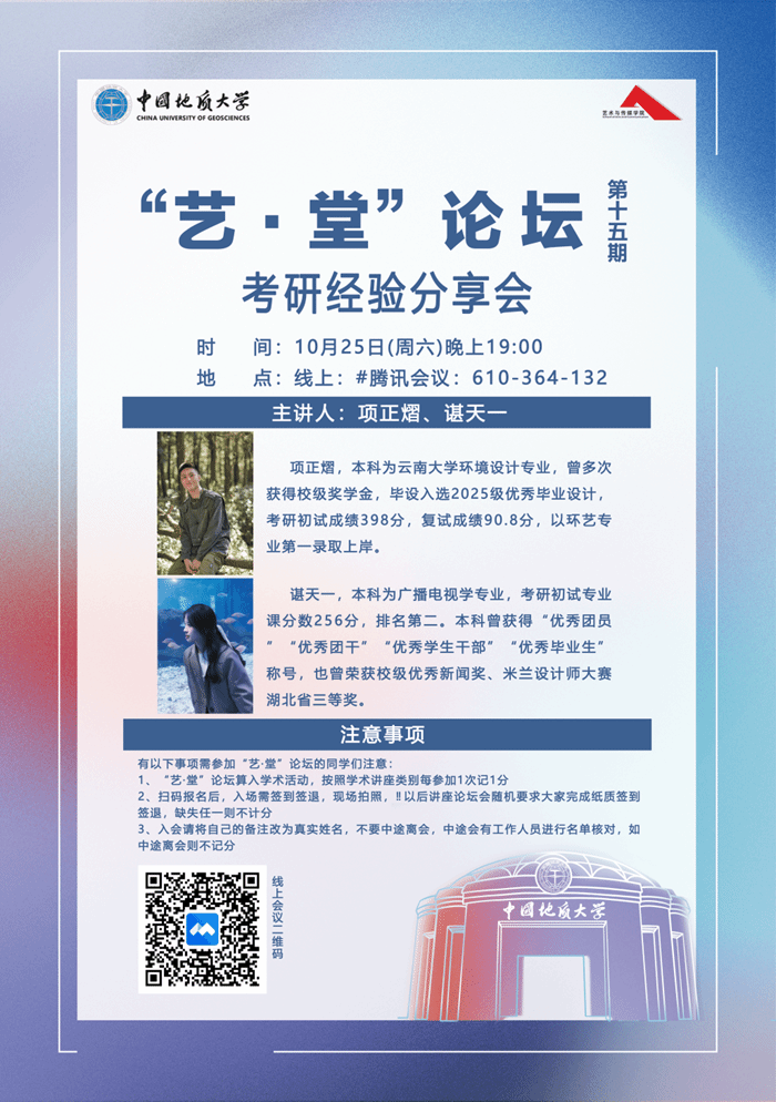 “艺・堂”论坛第十五期(学风建设系列第八期)考研经验分享会在线上腾讯会议举行。本次分享会邀请环境设计专业考研高分上岸的项正熠与新闻传播学备考经验丰富的谌天一担任主讲人,为参会同学带来干货满满的考研指导,助力大家高效备战。