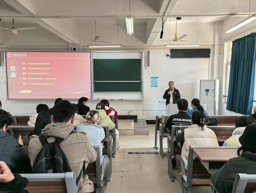 党委副书记边建华主讲,学工组辅导员曾戈晖主持,各年级宿舍长、楼栋长、楼层长、片区长参会,共同学习宿舍管理相关政策文件,明确岗位职责与工作方向。