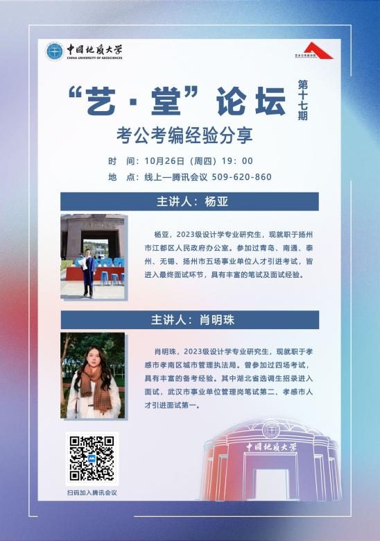 2023年10月26日晚上19:00,“艺·堂”论坛第十七期考公、考编经验分享会于线上腾讯会议平台顺利举行。草榴